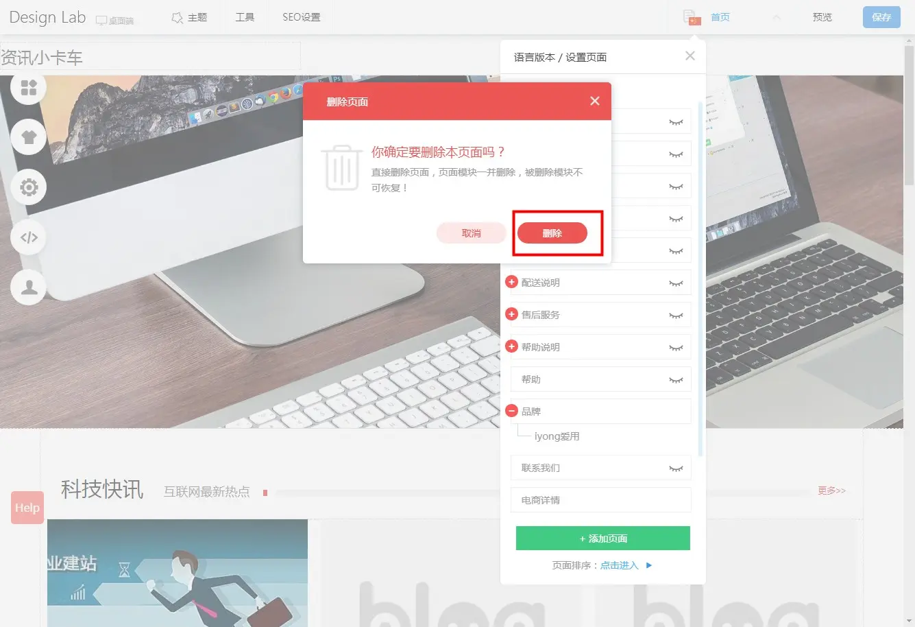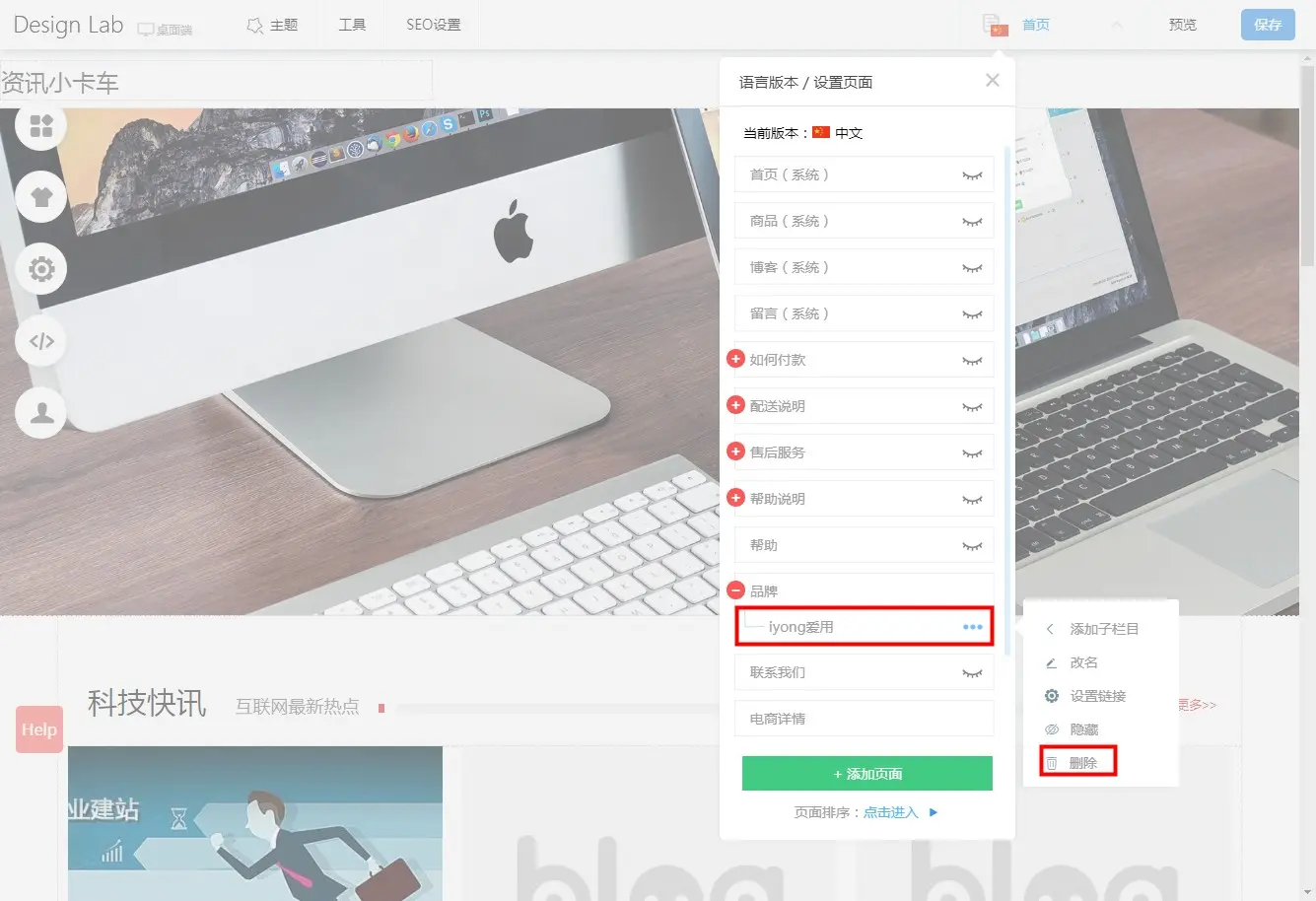 1、點擊【Page:首頁】,找到(dào)®φ∏α要(yào)删除的(de)欄目,點擊【删除】