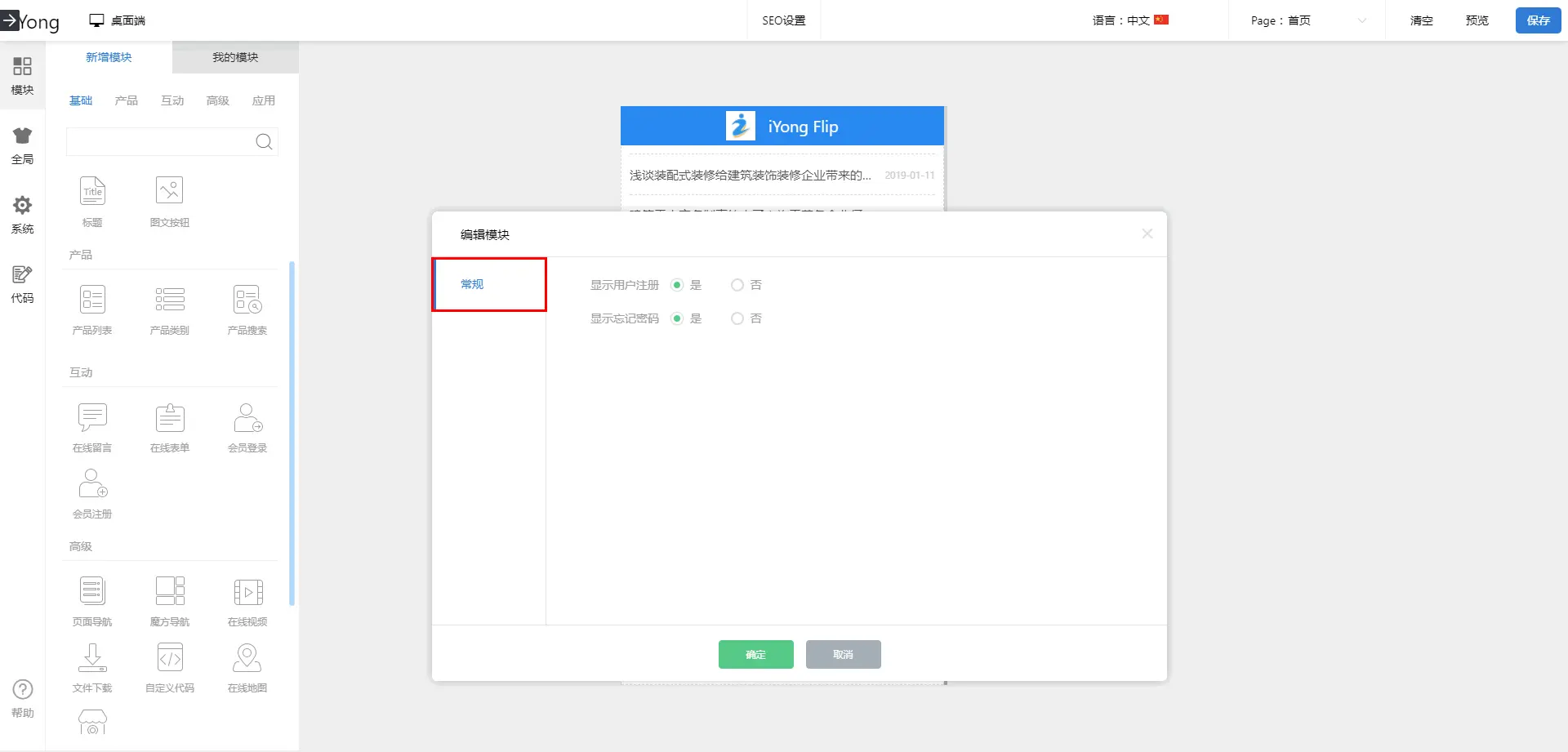 2.點擊【模塊】-【互動】,分(fēn)别将【會(huì)員(yuán)登≥₹錄】和(hé)【會(huì)員(yuán)注冊】拉進≤βε移動端布局頁面;