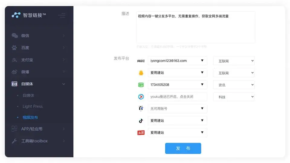 現(xiàn)在愛(ài)用(yòng)建站(zhàn)-智 ₹ε慧鏈接已經有(yǒu)13+流量入口了(le₩¶''),新增的(de)自(zì)媒體(tǐ)-頭條号怎麽使用(yòng)?
